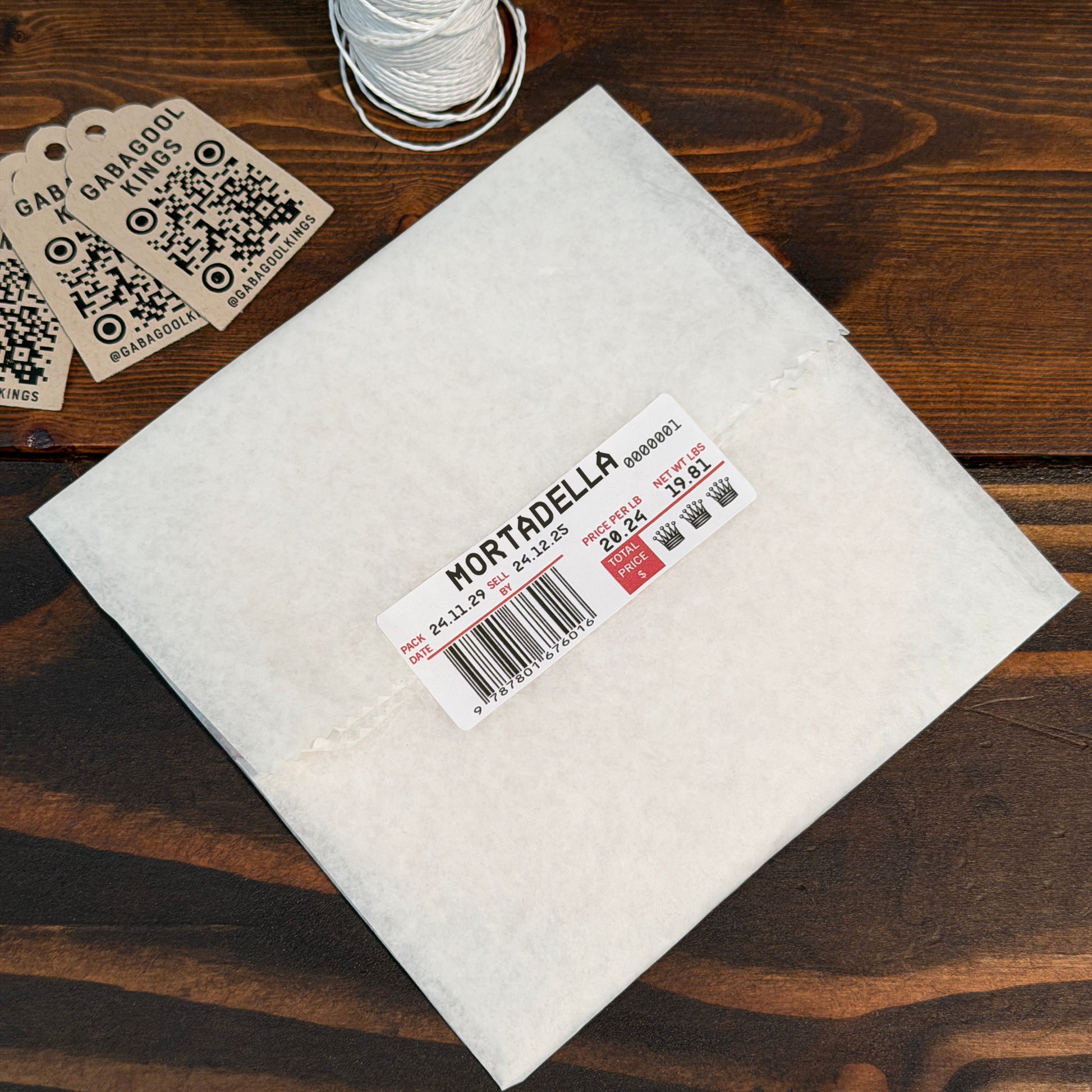 Hanging from Butcher's Twine, individually wrapped and deli labeled